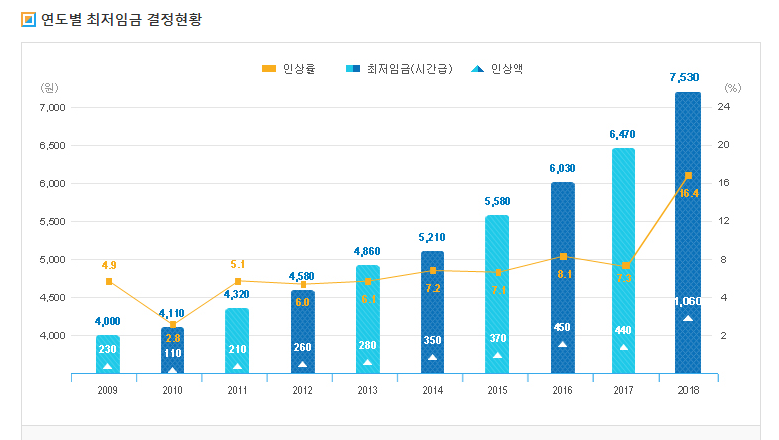 이는 2018년에 적용되고 있는 최저임금 시급 7,530원에 비해  820원(전년 대비 10.9%) 인상된 수준으로