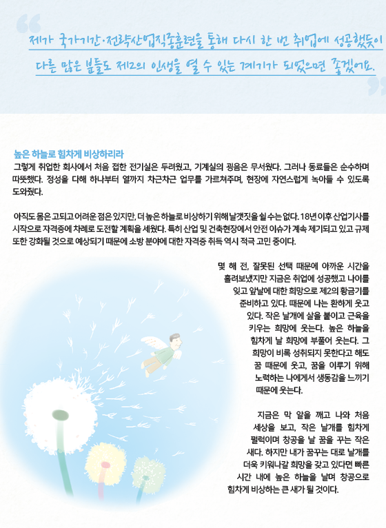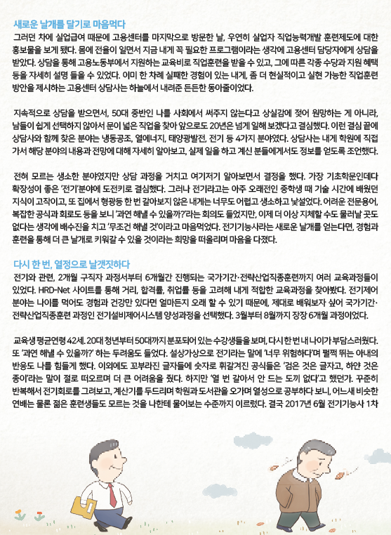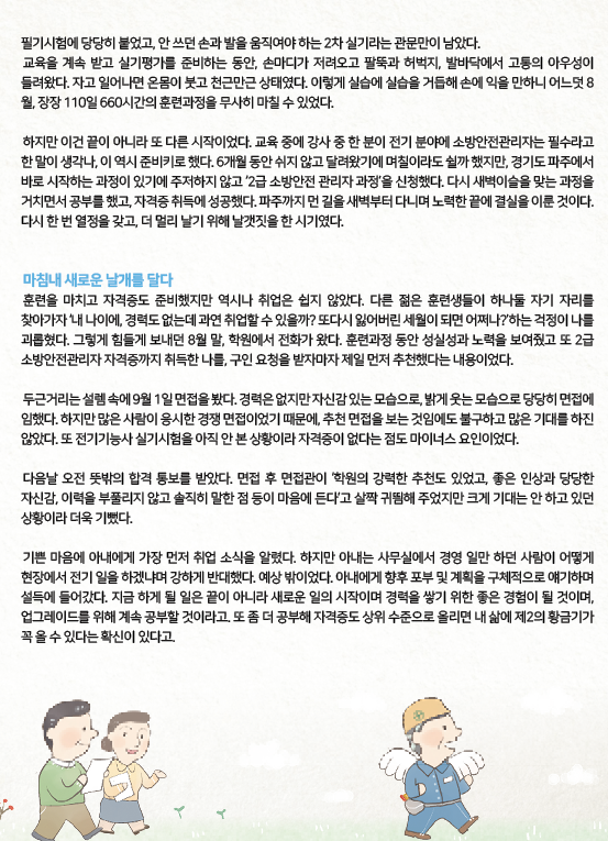 수기공모전 대상을 수상한 문○○(남, 56세) 씨는 회사 부사장으로 근무하다가 갑작스런 구조조정으로 퇴직 후, 편의점 알바까지 고려하며 시간을 보내다 국가기간.전략산업직종훈련에 참여하여 전기기능사와 소방안전 관리자 자격증을 취득해 재취업에 성공하였다.