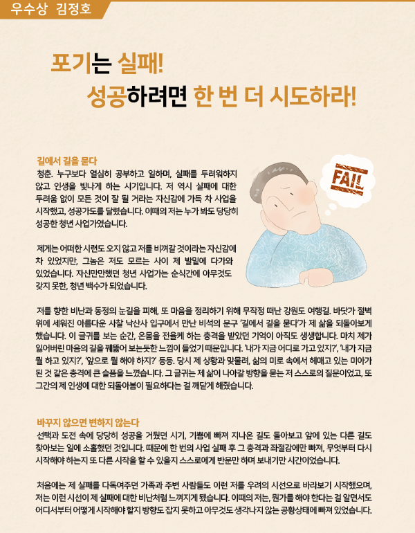 최우수상을 수상한 김○○(여, 25세) 씨는 금융권 취업을 희망하다가,은행 현장실습 경험과 고용센터 상담과정에서 자신에게 맞는 진로를 다시 정한 후 취업성공패키지 및 내일배움카드제를 통해 직업상담사 자격증을 취득한 후 취업에 성공하였다.