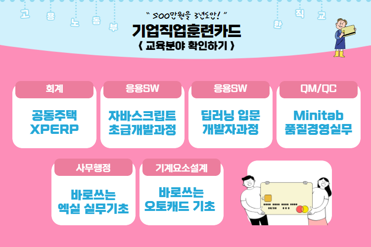 이와 같은 기업직업훈련카드는 중소기업에 장기적인 직업훈련 체계가 정착되도록 최대 3년간 지원 됩니다!