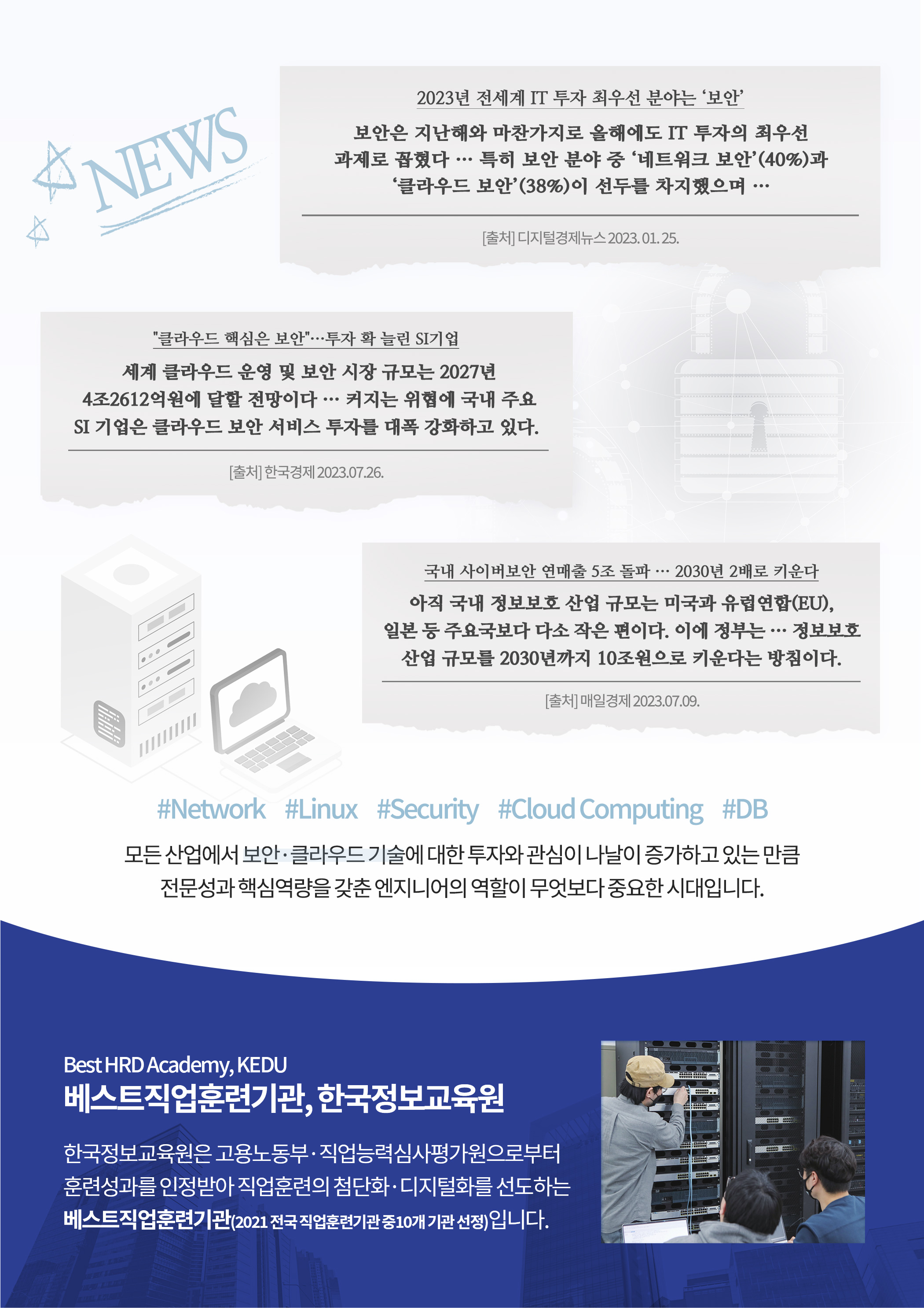 베스트직업훈련기관 한국정보교육원의 클라우드 교육 과정을 통해 보안 엔지니어로 새로운 커리어를 시작해보십시오.