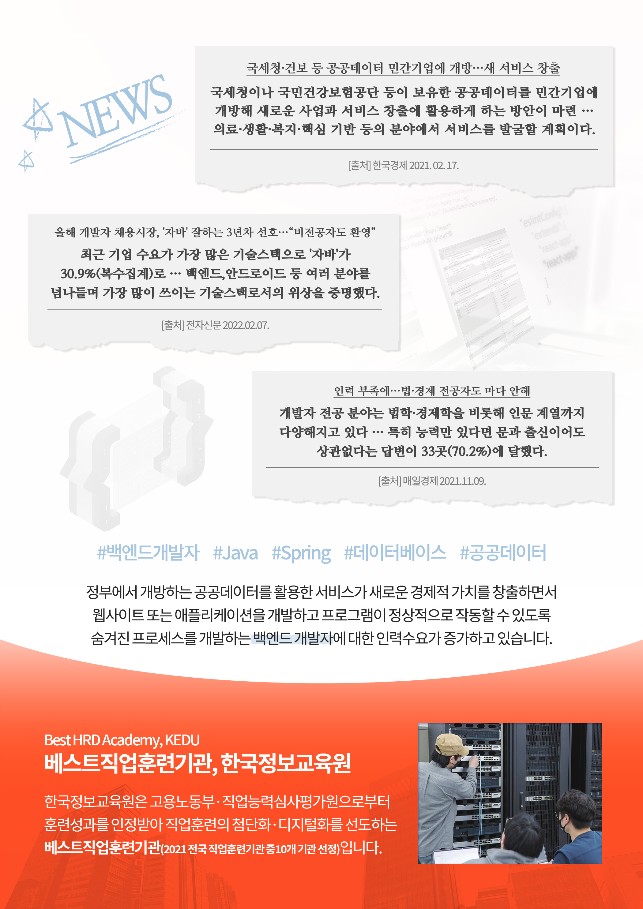 베스트직업훈련기관 한국정보교육원의 자바 과정을 통해 공공데이터 융합 개발자로 새로운 커리어를 시작해보십시오.