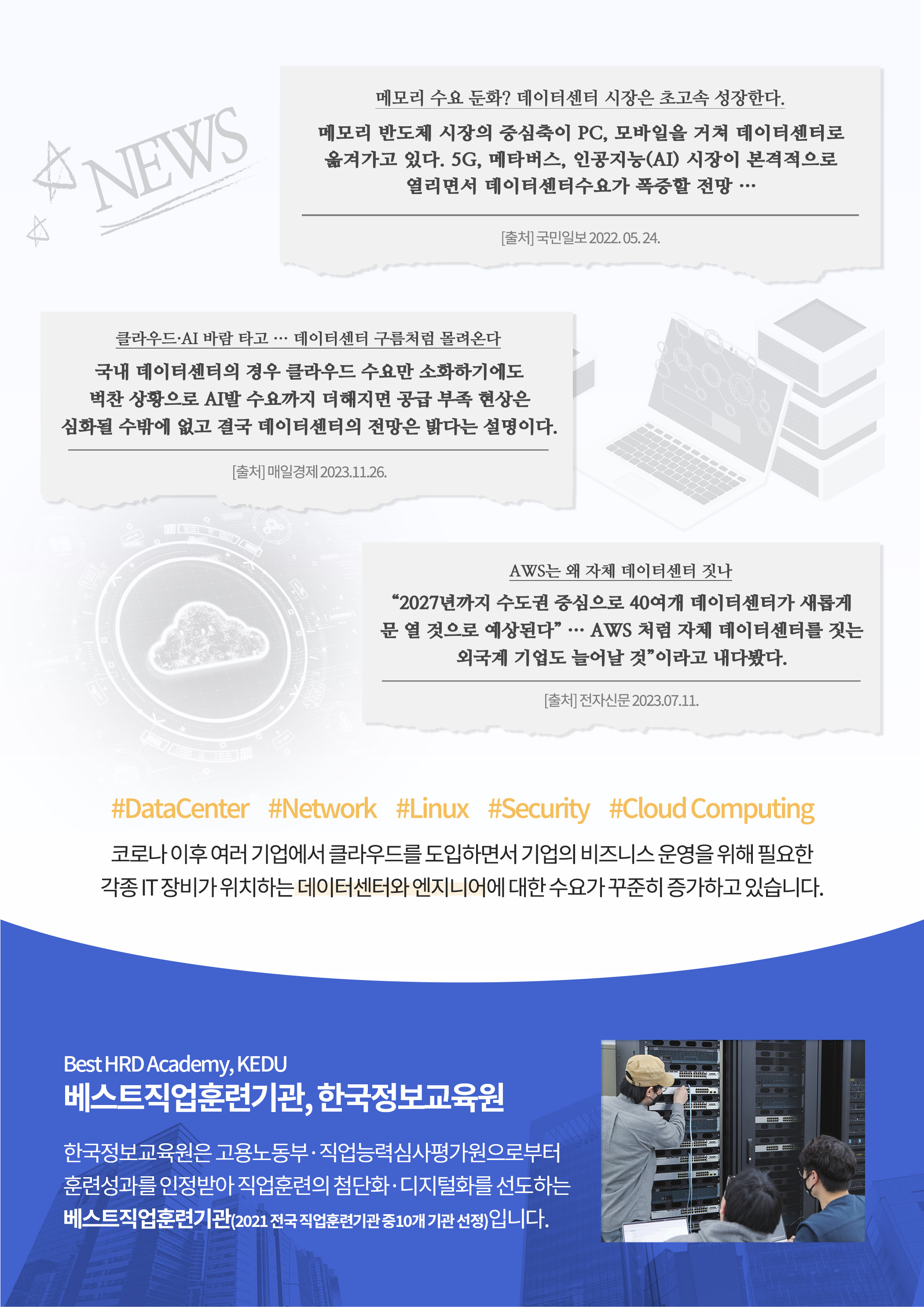 한국정보교육원은 클라우드 데이터센터 엔지니어 양성 과정을 통해 클라우드 및 보안 분야로 진출할 차세대 인재를 육성합니다.